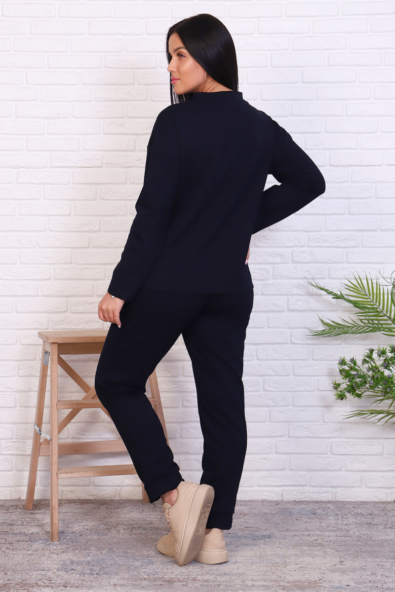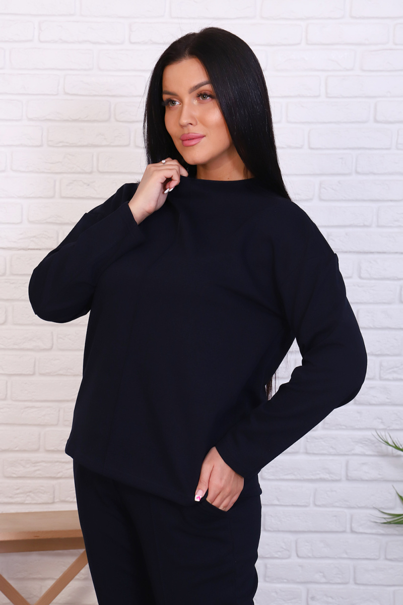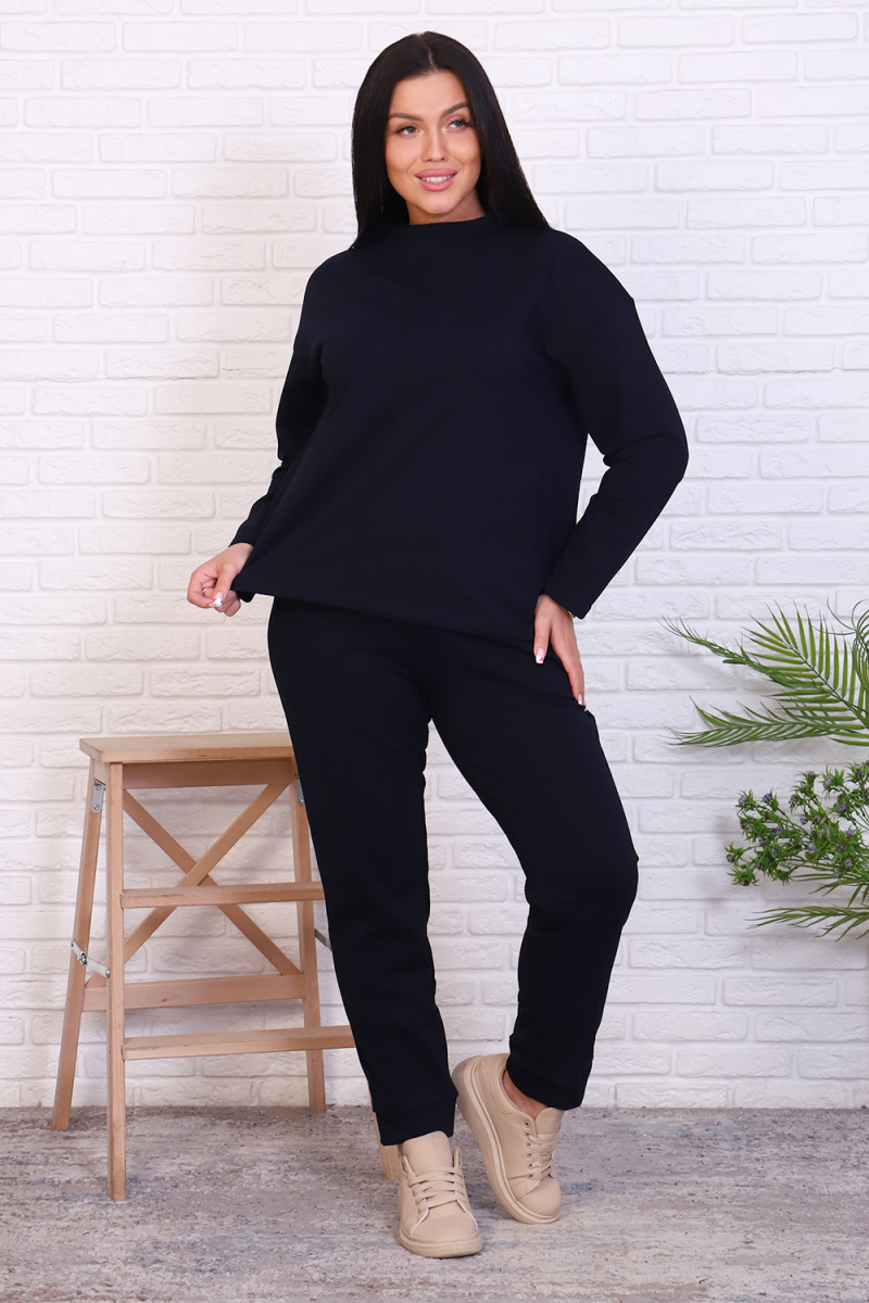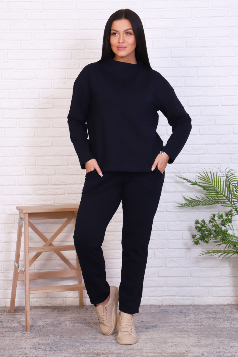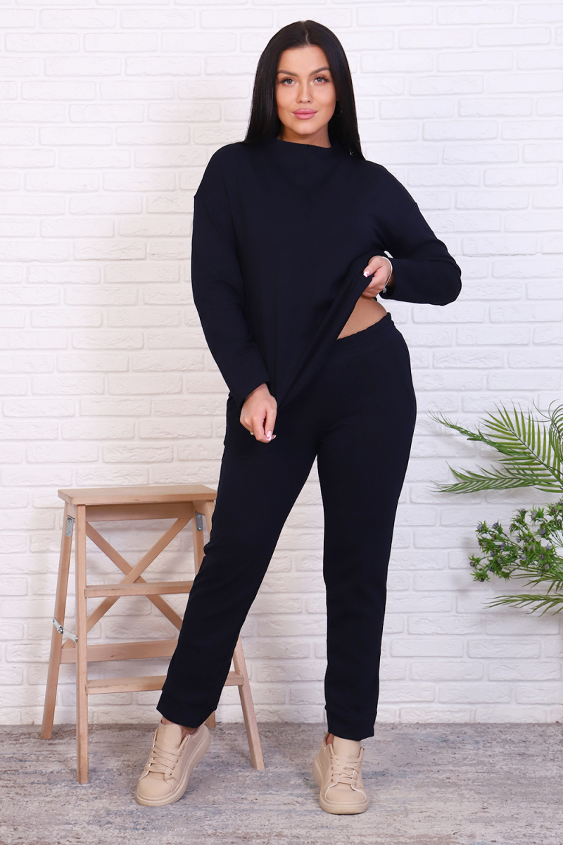 Стильный базовый костюм из хлопкового трикотажа отличного качества. Брюки прямого кроя, зауженные к низу, высокая посадка с простроченными стрелками, низ без резинки(не режет ногу), карманы в швах. Трикотажный джемпер длиной до середины бедра. По центру переда декоративный вертикальный защип вытягивает и стройнит. Горловина джемпера с цельнокроеной стойкой, обработана притачной обтачкой. Рукава джемпера длинный двухшовный, рубашечного кроя, линия плеча спущена. Полные размеры