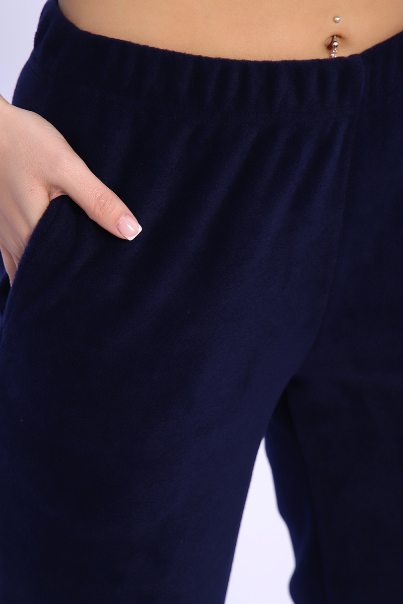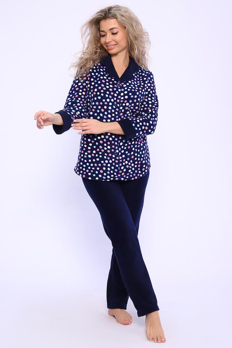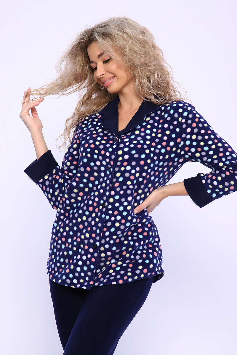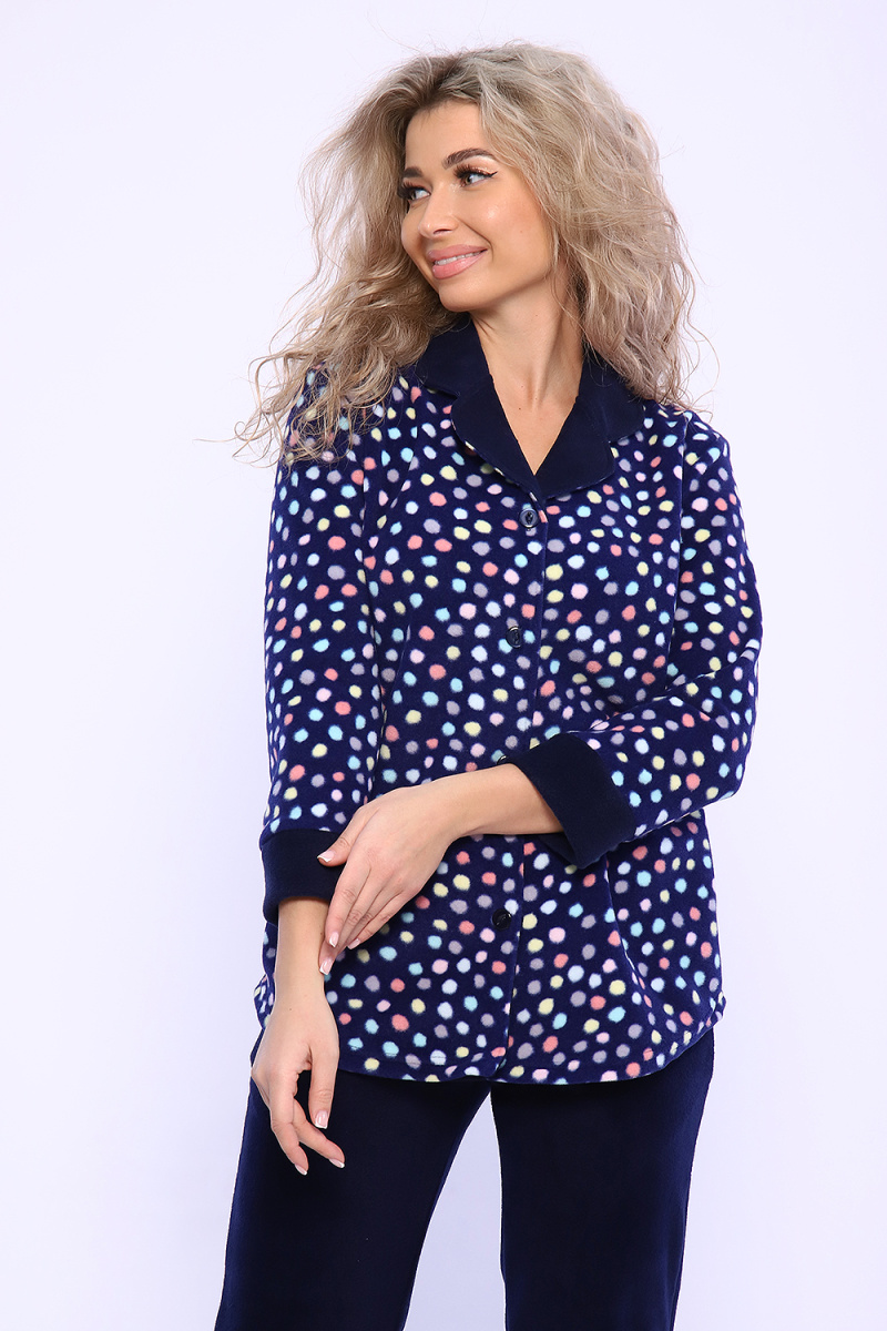 Домашний женский костюм из мягкого, теплого флиса. Кофта полуприлегающего силуэта, застегивается на петли и пуговицы. Длиной до бедер с фигурной линией низа. Рукав втачной, длиной 3/4 с манжетом из отделочной ткани. Воротник пиджачного типа с закругленными углами, из отделочной ткани. Борта, воротник и лацканы отстрочены. Домашние брюки прямого кроя с вместительными карманами в боковом шве, комфортный пояс на резинке, располагается на линии талии, длина брюк ниже щиколотки.